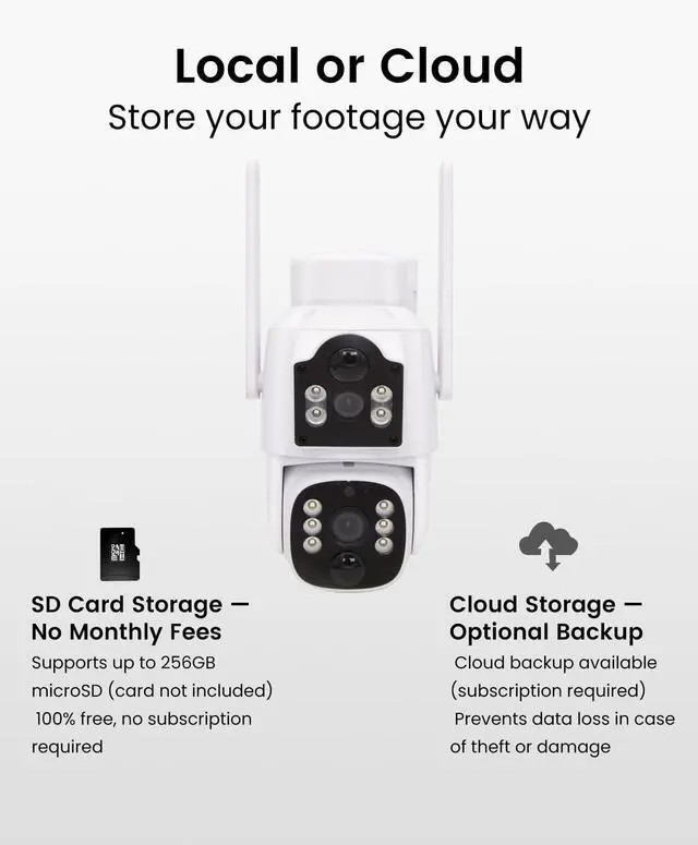 [Local + Cloud Storage Options] Choose how you store your footage: record locally with an SD card (up to 256GB, not included) or subscribe to secure cloud storage. Easily playback recordings anytime through the app.
