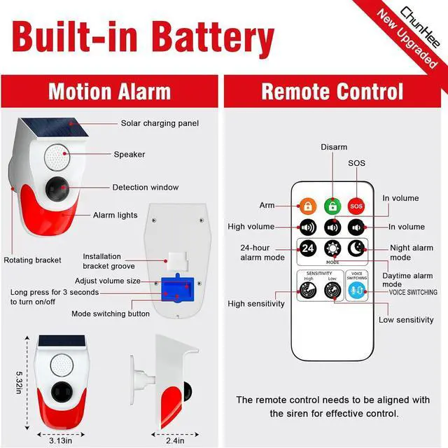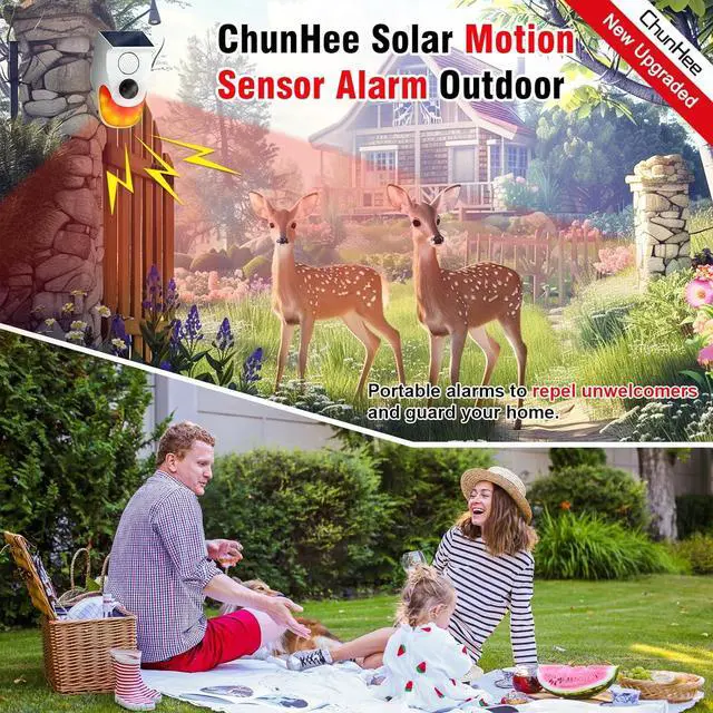 Motion Sensor Alarm Outdoor:Are y tired of rodent animals invading destroying your home and garden?The solar alarm motion detector detection angle is 110°,the ourdoor alarm inchude 3 working modes to choose,can drive animals out of your home,24 hour guarding for your home and property