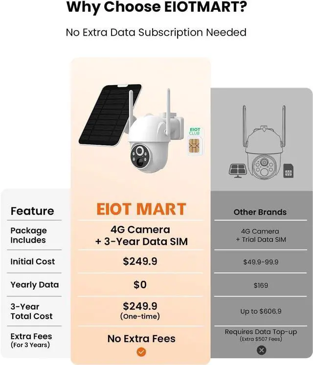 3-Year Unlimited Data SIM Included This 4G LTE cellular security camera comes with a pre-installed EIOTCLUB SIM card that includes 3-year unlimited data planno contracts, no monthly fees, and no hidden fees. Enjoy real-time monitoring without any data subscriptionsimply activate the solar camera, and it will automatically connect, giving you long-term, hassle-free security. After the 3-year period ends, you can easily recharge service directly through the EIOTCLUB app