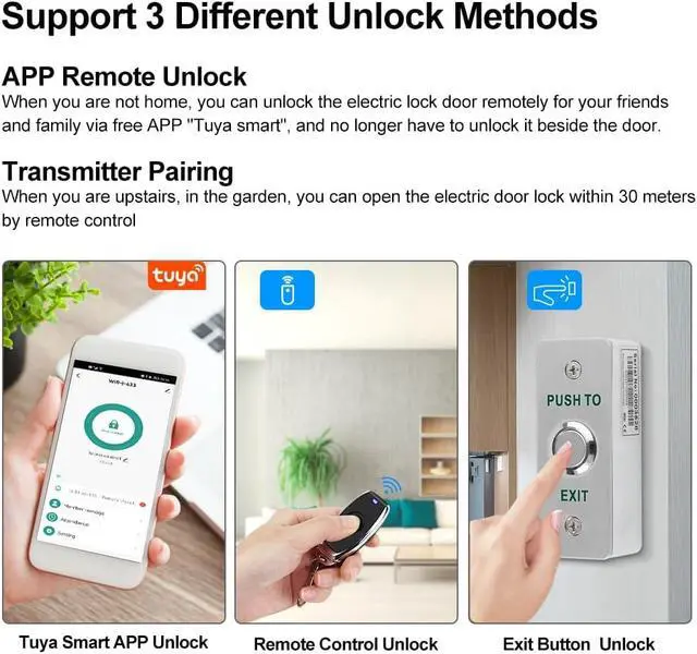 APP UNLOCKING AND REMOTE CONTROL Through wifi, You can pair this kit with your smart phone on Tuya Smart APP easily, then control your lock anywhere with Internet signal. All 4 remote control transmitters can be added to this controller together, up to 30 meters(98 feet) remote control distance, you can open the door for your guests immediately. (Check App connection and remote control pairing video on product page)