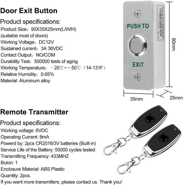 PACKAGE INCLUDING Smart Access Controller + Buzzer + Electric Mortise Lock + Metal Shell Indoor Exit Button + 2 Remote Transmitters + DC 12V Power Adapter + Cables and Screws + User Manual