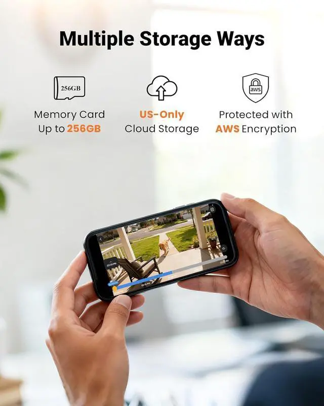 (5). [ 24/7 Recording & Dual Storage Options ] __ The window camera continuously records around the clock to ensure home security. Supports memory card storage (up to 256GB, not included) and US cloud storage (Paid subscription required). Utilizing AWS cloud encryption, all indoor and outdoor monitoring data is strictly stored within the United States. This ensures data localization, building a robust defense for your home privacy.