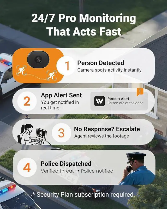 (3). [Smart Motion Detection & AI Scene Recognition & 911 Emergency Call] __ Beyond basic motion alerts, the A60 camera employs advanced cloud-based AI models to distinguish between animals, humans, or vehicles (requires additional subscription). It instantly pushes more precise descriptive alerts to your phone. If no one responds to the notification, it will automatically review video footage and directly dial 911 to dispatch police to verify your safety.