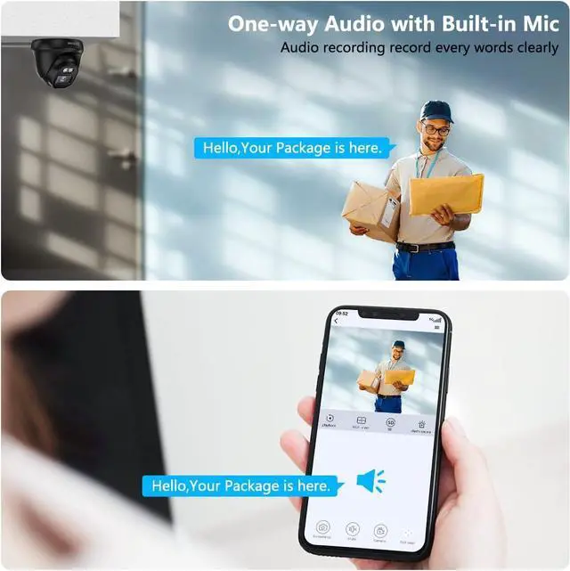 {Audio Camera} With built-in microphone in the camera, security camera allows you to listen and watch what happened through the APP in your phone clearly and instantly no matter where you are.Please note camera is a one-way audio, you can only hear the other party talking, not the conversation.