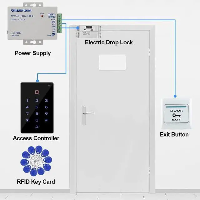 This is a full set of access control system kit, including a access controller, 12VDC power supply, electric magnetic lock and a switch button, suitable for door entry systems of appartment, offices, factories, hotel, family house, school, etc.