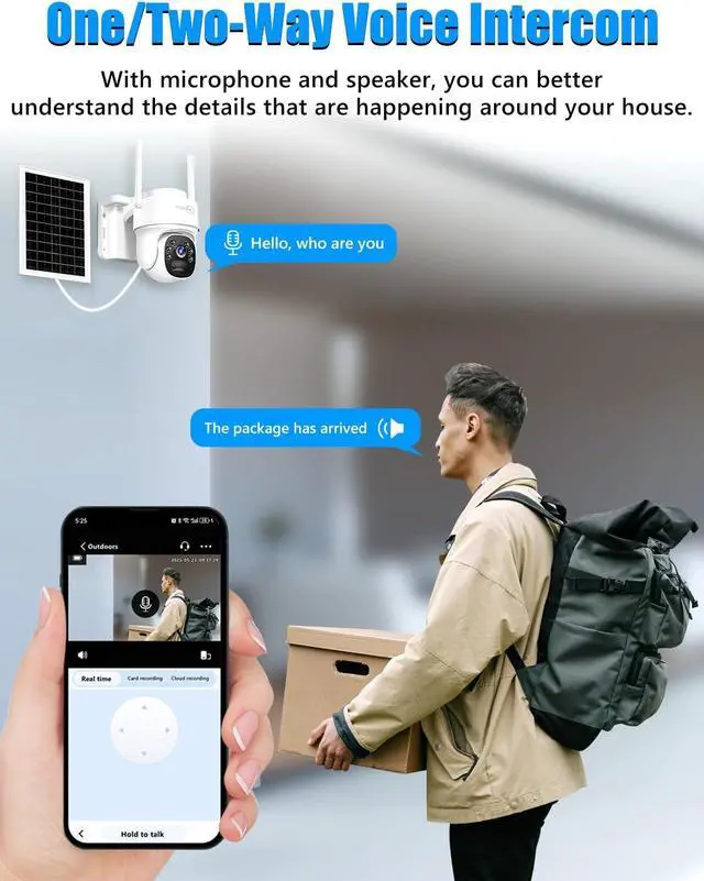 PIR Motion Detection and Tracking & Two-way Talk This 4G LTE camera features a sensitive PIR motion sensor that allows the camera to detect motion based on heat signatures and automatic tracking the activites. It will send alerts to your phone APP and deter intruders through sound and light alarms when it detects motion. Meanwhile, the camera is equipped with a two-way talk function, you can communicate through the camera from any location and at any time.