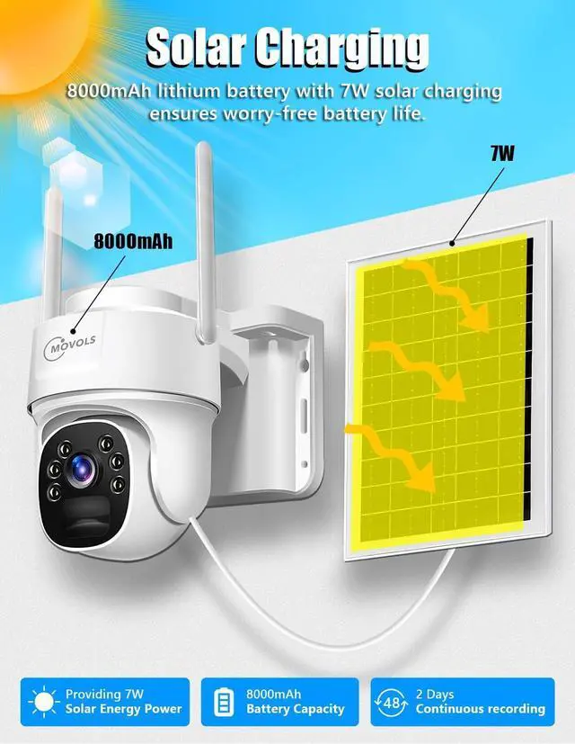 Non-Stop Solar Powered,Energy EfficientThe no wifi solar powered security camera features 8000mah high-capacity rechargeable battery and a 7W solar panel, it makes a constant power supply, saving energy and protecting the environment. With an IP65 waterproof rating, they are designed to withstand diverse environments, ensuring their long-lasting performance. Provide an ideal solution for outdoor use.