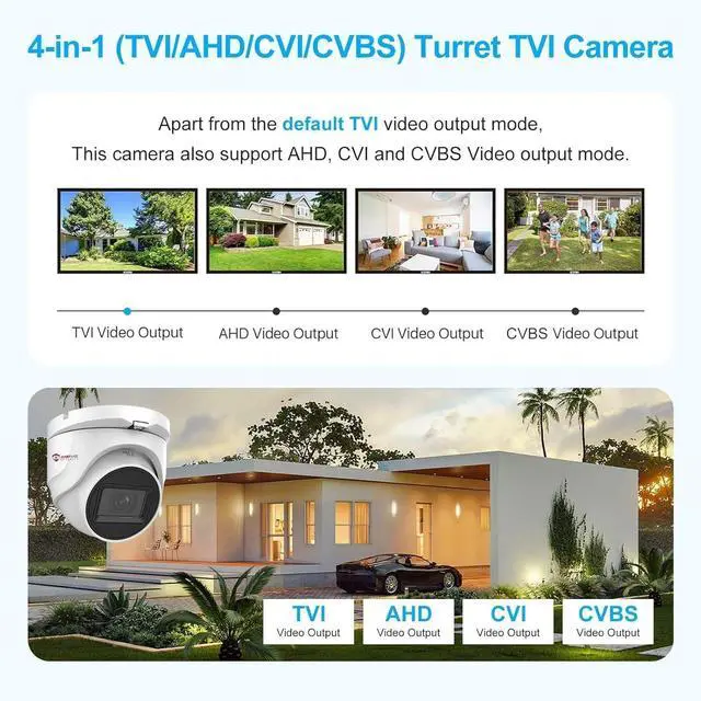 5MP 4-in-1 Security Camera & Default TVI: This 5 Megapixel analog cctv camera hd supports AHD/TVI/CVI/CVBS video output (default TVI), and it is compatible with Anpviz DVRs and most third-party DVRs on the market DVRs for 24/7 recording. With the foolproof joystick switch on the cable, you can freely access the menu and switch the video output mode by pushing the control button.