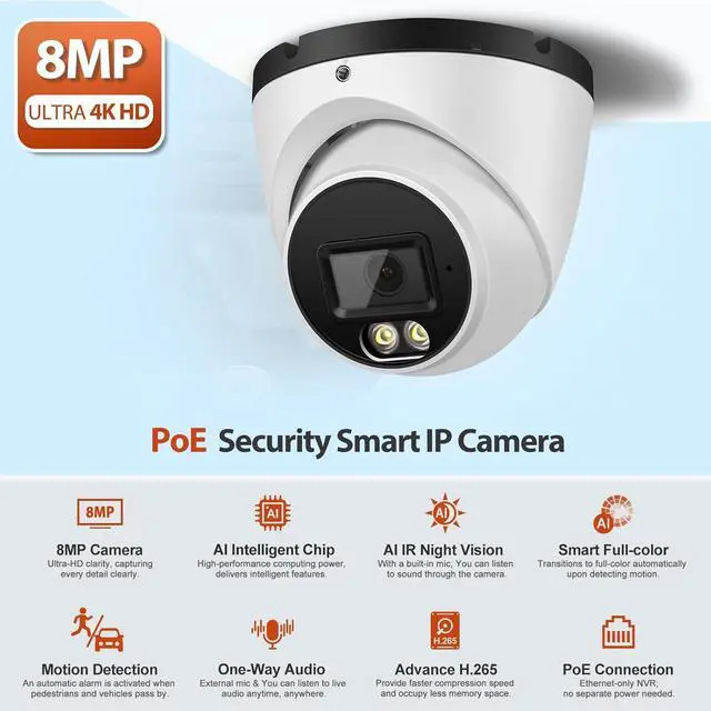 4K 8MP High Definition and Smart Color Night Vision This 4K resolution ultra HD (3840*2160) provides quality image and video.Built-in 1/2.7" latest technology CMOS sensor and chipset with 2.8mm HD lens allows you to cover more ground.Built-in 2pcs lights,premium color night vision up to 65ft.(Note This is a FIXED IP camera).