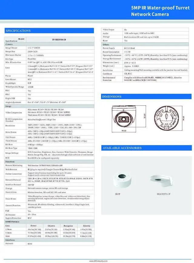 Support three streams, H.265+ /H.265 /H.264+/H.264/MJPEG coding, Max. resolution: 5MP (2880 1620)