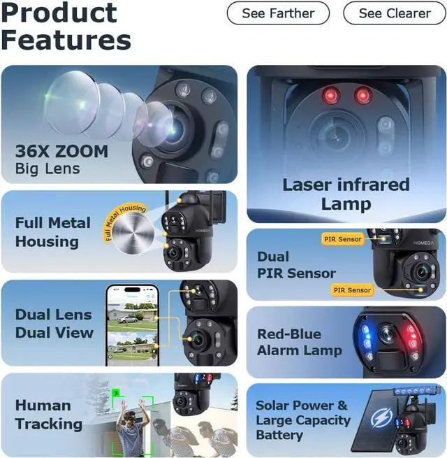 50X Optical Zoom Dual LensThis solar camera has a 2.8mm lens and a 4.9+47.04mm lens for clear zooming on distant objects. The UBOX app allows you to monitor both lenses on separate screens for enhanced surveillance.