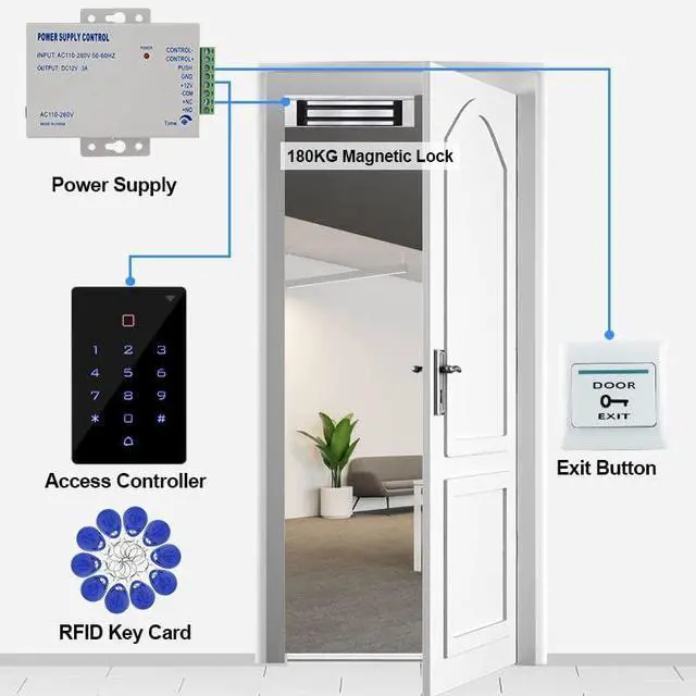 This is a full set of access control system kit, including a access controller, 12VDC power supply, electric magnetic lock and a switch button, suitable for door entry systems of appartment, offices, factories, hotel, family house, school, etc.