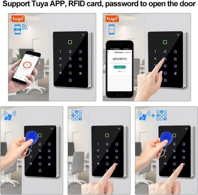 This access controller supports to pair with Tuya APP by WIFI, which enables you to remotely lock and unlock your door from anywhere in the world. Also, you can share control with your families and friends, and click reminder information to view logs.