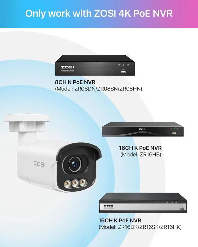 Only Compatible with ZOSI 4K PoE NVRsThis PoE camera is an add-on camera. It cannot be used separately. It needs to connect the Ethernet cable and NVR to work. It is only compatible with ZOSI 4K PoE NVR.(Model: ZR16HB,ZR08HN,ZR16HK).