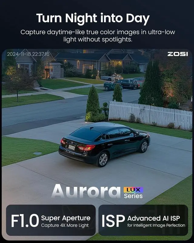 4K Ultra HD & True Color Night VisionExperience the superior clarity of ZOSI 4K PoE Security Camera, featuring advanced Aurora Lux technology that delivers true color night vision. It makes the night scene as clear as the day with the F1.0 super aperture and 1/1.79" image sensor. The 16:9 aspect ratio is specifically chosen to better accommodate human eye viewing habits, making the details clearly visible.