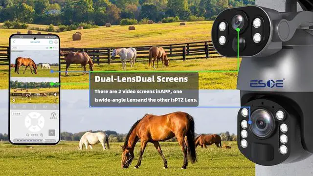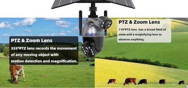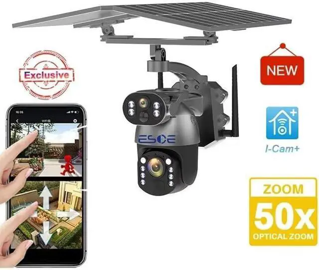Outdoor Wireless Solar Security CameraDual-lens camera with ultra-high-definition images. One has 50x zoom lens, one has super wide angle lens. High-res lens and telephoto lens for 50X optical zoom, clearly monitoring up to 36m/118ft. View two live videos simultaneously on phone for yard or house safety.