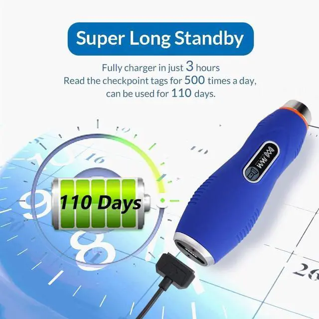Multifunctional Patrol Reader. With the flashlight function for night patrol. The irradiation distance is 5~6m. You can set up to 200 alarm clocks to effectively remind the patrol time; Unique pedometer function, real record guard work status.