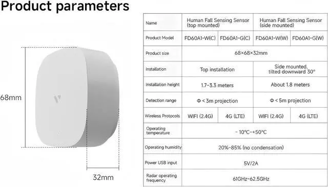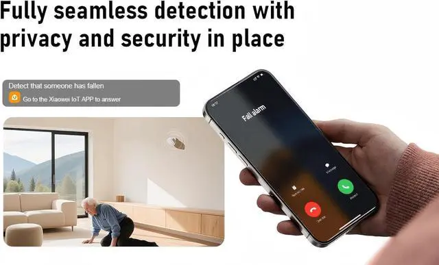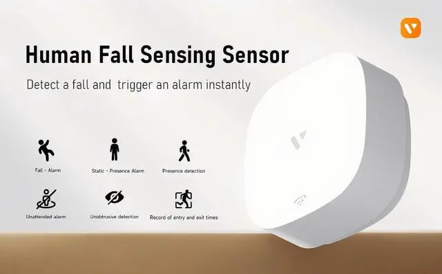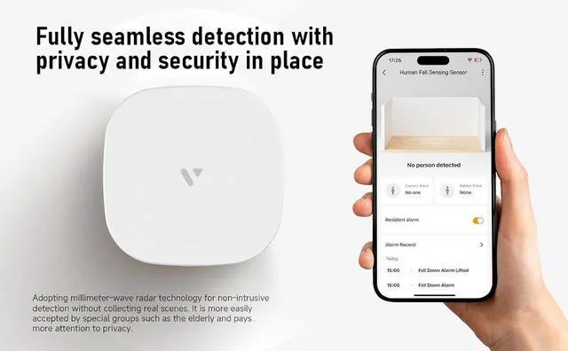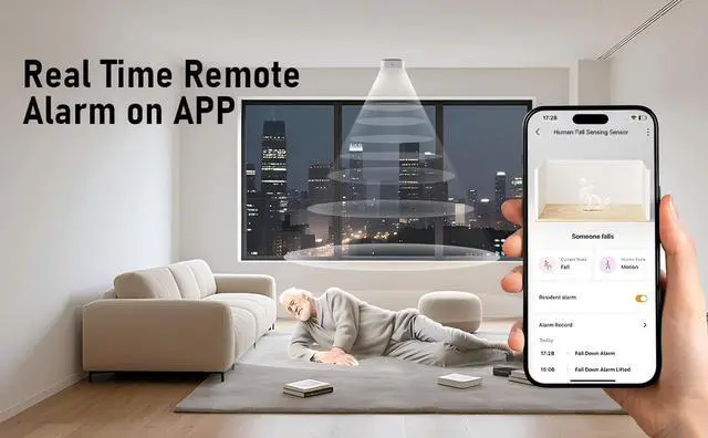 [Human Fall Detection] The 60GHz mmWave Infineon Radar Chip can detect Human Fall and real-time trigger different scenarios and automation. Fall Detection sends alerts via the app if a fall is detected. (Note: Fall Detection works only when ceiling-mounted.)