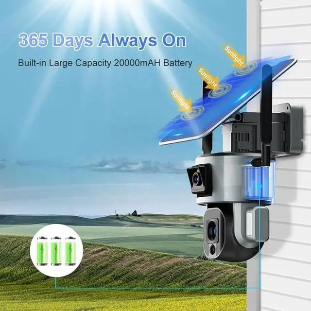 With Solar Panel & Built-in 20,000mAh Battery With our solar panel, the camera can work uninterruptedly for 365 days, Under the same light conditions, 9 watt high power solar panels can convert solar energy into electricity faster. We are equipped with 20000 mA high-capacity rechargeable battery, can store more electricity, use more durable, thus ensuring that the camera will continue to work even at night when there is no light and on rainy days