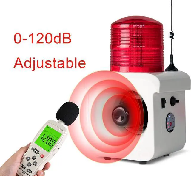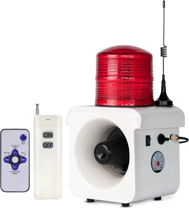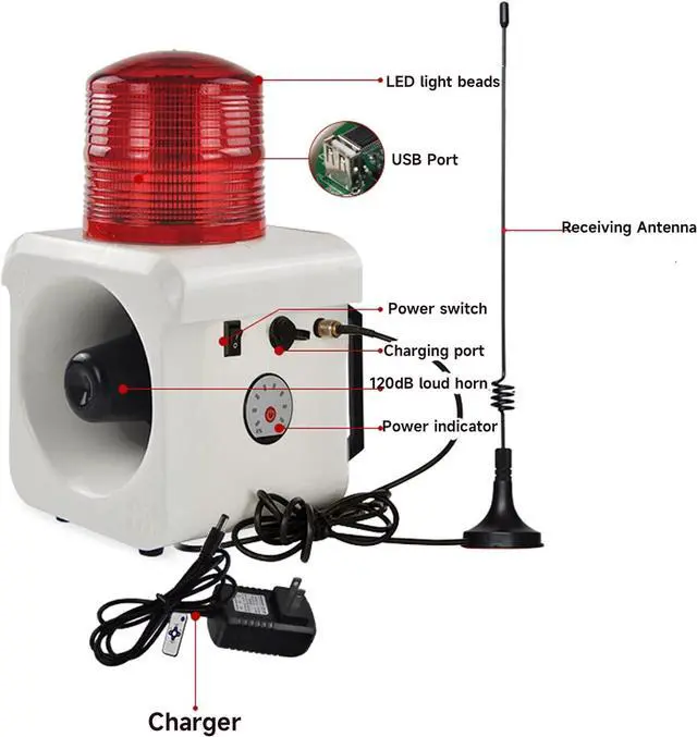 Audible & visual alarmWarning light using LED beads, high brightness and long service life. Horn speaker volume up to 120 decibels, it can be adjusted by small remote control. 12 tones are built into the alarm, and you can choose the tone you like by the remote control. or update the sound through the USB port.