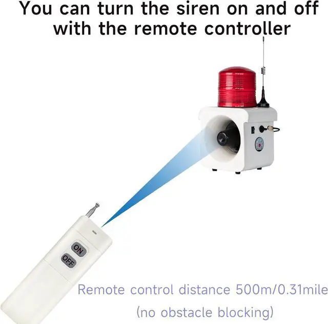battery powered remote control siren Large controller remote control distance of 500/0.3miles (no wall), control the alarm on & off; small controller remote control distance of 8m/26.2ft, it can adjust the volume & tone & alarm mode (sound only / light only / sound & light integrated alarm). Notes: the remote controller is powered by 9V batteries (not included, need to purchase separately)!