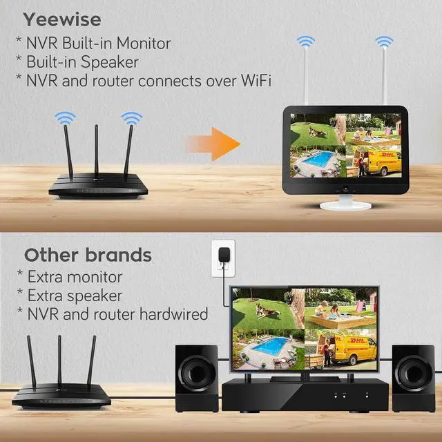 Dual WiFi - The NVR built-in monitor has two wifi modules, one for connecting cameras wirelessly and the other for connecting it to the internet for remote access. Therefore all your cameras connects to the monitor wirelessly, no cables needed; and you can connect the monitor to the router via WiFi, no need to hardwire them.