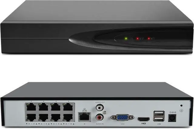 The NVR is equipped with 8 independent PoE network ports, 1 adaptive 10/100mbps Ethernet interface, and can perform 24-hour uninterrupted recording.