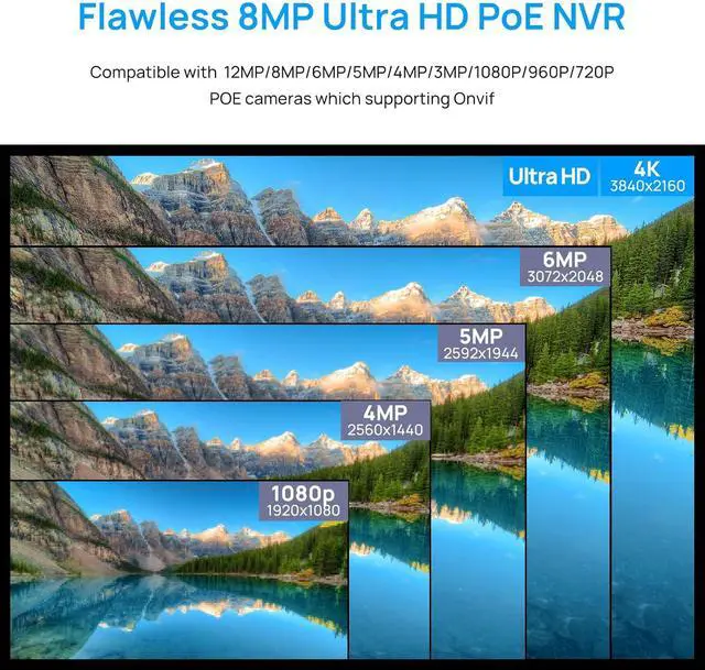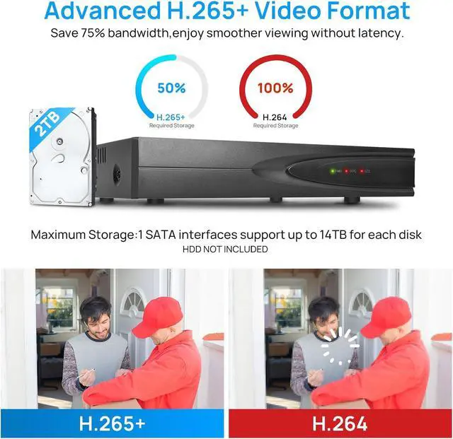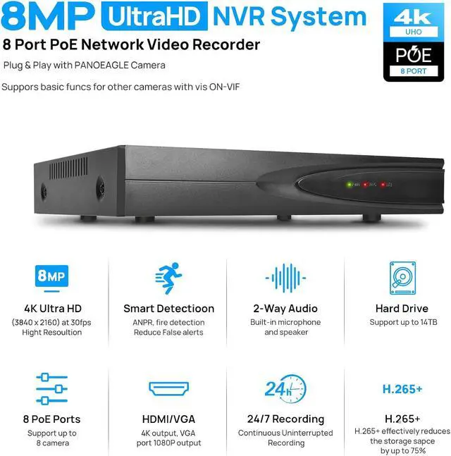 H.265+ compression effectively reduces storage space by up to 75%, while ensuring recording quality and maximizing recording time. It also provides HDMI and VGA outputs, with HDMI video output up to 4K resolution.