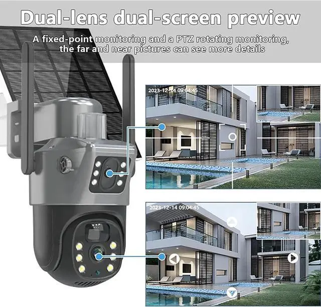 Dual Lens Three Views & 360° View Coverage: Dual lens outside camera can capture two areas simultaneously to record more detail in full view.The panorama camera has a wide-angle feld of view, display them simultaneously on one screen with no blind spots, Excellent resolution make sure an superior day and advanced color night vision and capture more detail in the darkness within 30 feets. The PTZ camera can be rotated to pan 350° and tilt 90°, capturing important moments from every corner.