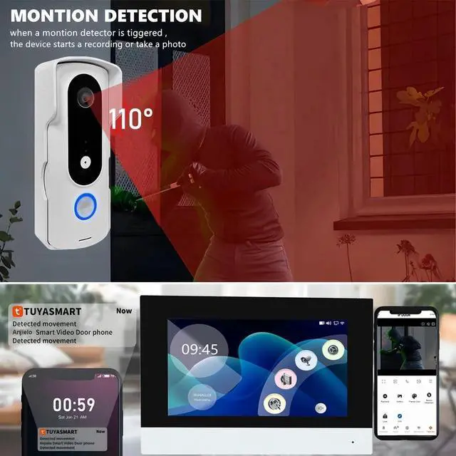 7 INCH MONITOR&1080P DOORBELL:7 inch indoor monitor built with easy operating system,slim design and fashionable Touch button. 1080P Outdoor doorbell with HD camera, 110 degree wide view angle,Night vision,Rainproof and Anti-vandal design. Doorbell can connect the all electronic lock.