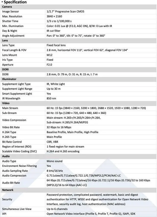 High quality imaging with 8 MP resolution Support Human and Vehicle Detection Smart Hybrid Light: advanced technology with long range Built-in microphone for real-time audio security Support on-board storage up to 512 GB (SD card slot) Efficient H.265+ compression technology Water and dust resistant (IP67)