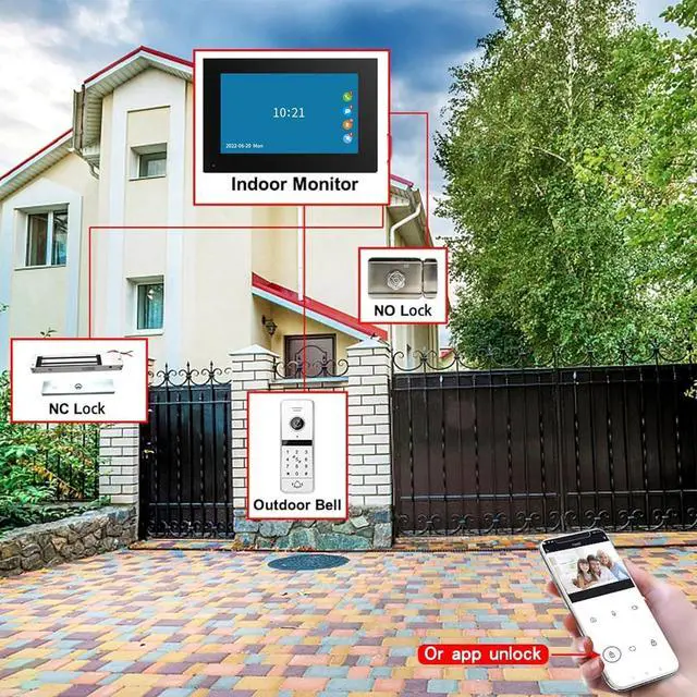 7 INCH TOUCH MONITOE AND 1080P DOORBELL:7 inch touch screen monitor,touch operation, hands-free, support Wifi to connect to the Internet. Outdoor doorbell with waterproof cover, built-in infrared sensor and 1080P camera,130o wide angle, night vision, waterproof, dustproof and vandal resistant. You can connect all 12V electronic locks