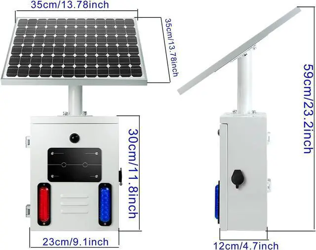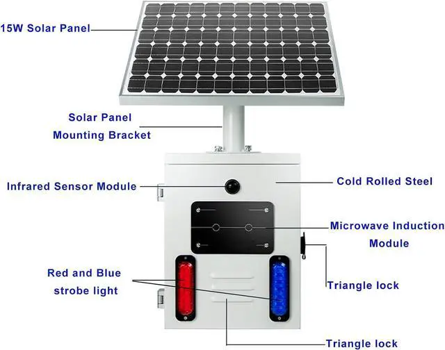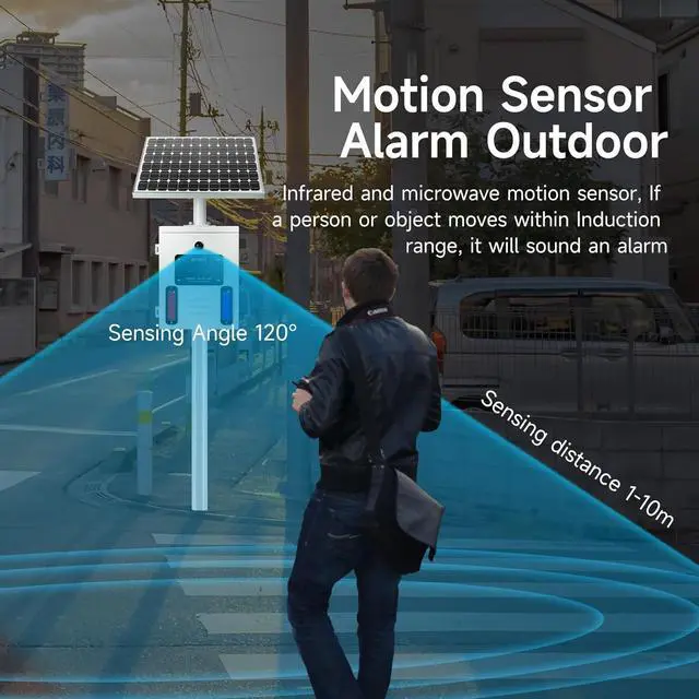 Motion sensor siren overviewThe alarm is equipped with 15 watt solar panel and 8000mAh battery power, suitable for outdoor without wiring. Sensor detects movement of people/vehicles automatically alarm. The solar panel is installed facing the sun. It can be used for a long time under special circumstances such as rainy environment and night. Open the internal power switch before use.