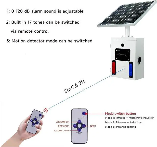 Loud siren hornThe motion detector siren can issue 120dB alarm sound and red&blue strobe lights, warning effect is obvious. Alarm systerm built-in 17 tones, microwave, infrared and microwave + infrared 3 motion detection induction modes, alarm sound, tone and induction modes can be adjusted by remote control! You can upload your custom audio by USB port.