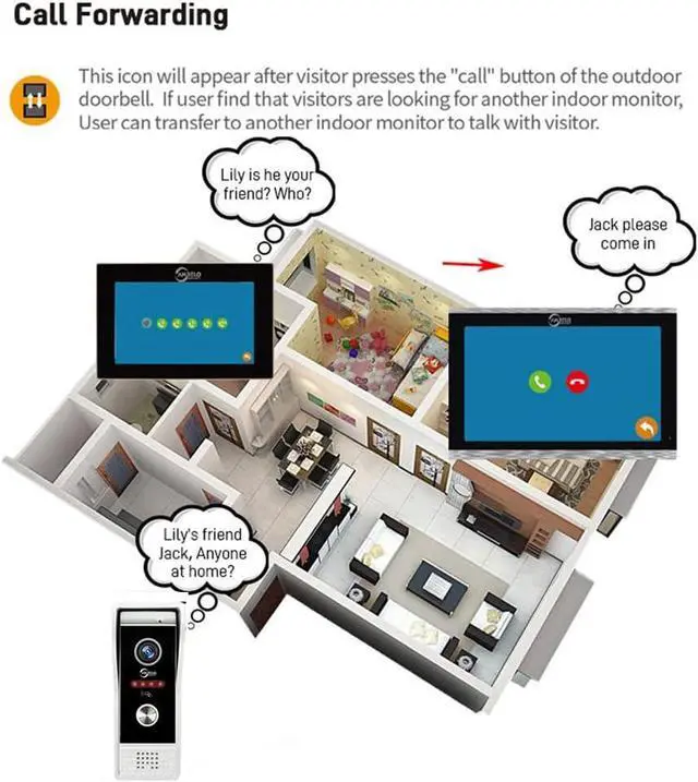 TWO WAY AUDIO:When someone rings the doorbell, all monitors and phone will ring. you can see, hear and talk to anyone in front of your door from anywhere and you won't miss any visitorsYou can answer and unlock the door with any monitor.You can connect all 12V electronic locks. All monitors support call forwarding or internal speaking (audio only) between indoor monitors.