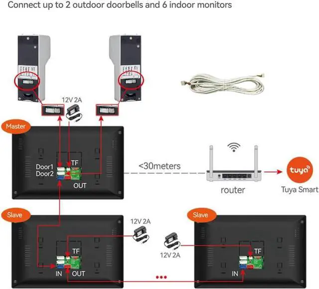 ABOUT WIRING:The monitor to doorbell need wired with 4 wires. 3M extension cable is included in the box. You can extend the distance from monitor to doorbell with RVV4(4-core wire)/Cat5/Cat6 cable as needed, the maximum distance from monitor to monitor is 100-200 metres. The main monitor can be connected to your home Wifi network, allowing you to view visitor information via your mobile phone at any time.