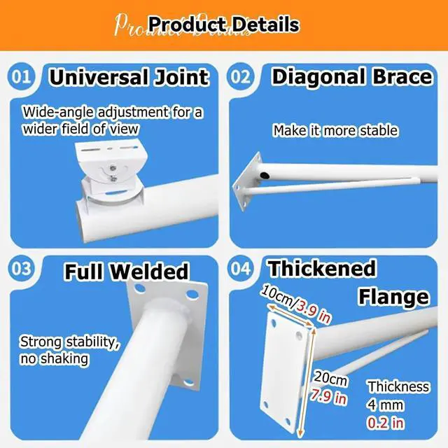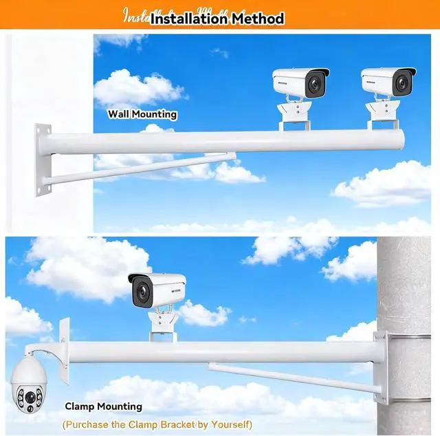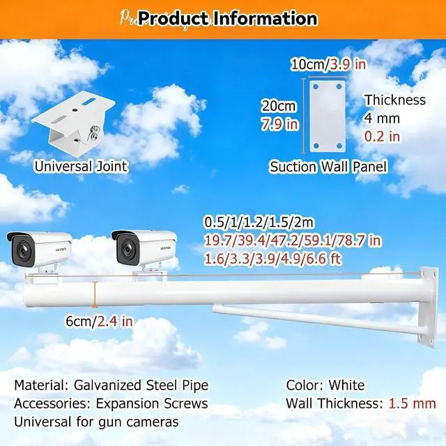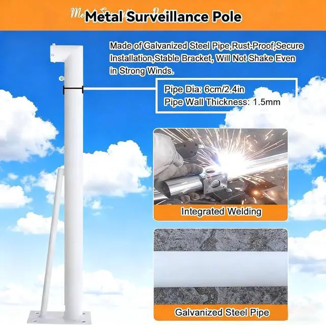 STURDY RUST-RESISTANT CONSTRUCTIONMade of rust-resistant galvanized steel with 6 cm/2.4 in diameter and 1.5 mm wall thickness. Jointless and gap-free design withstands strong outdoor winds, shaking, and ensures stable installation of surveillance equipment.