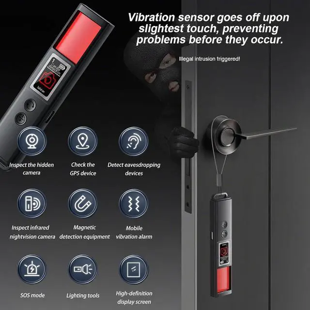 9*Newly Upgraded Inspection Capabilities:Hidden Camera Detector is capable of detecting a wide range of surveillance or listening devices: 1.Detectsecret photography equipment 2.Detect eavesdropping devices 3.Detect GPS devices 4.Detect Test the infrared night vision camera equipment 5.Magnetic detection equipment 6.Mobile vibration alarm 7.SOS mode 8.Lighting tools 9.Supports switching between Chinese and English.