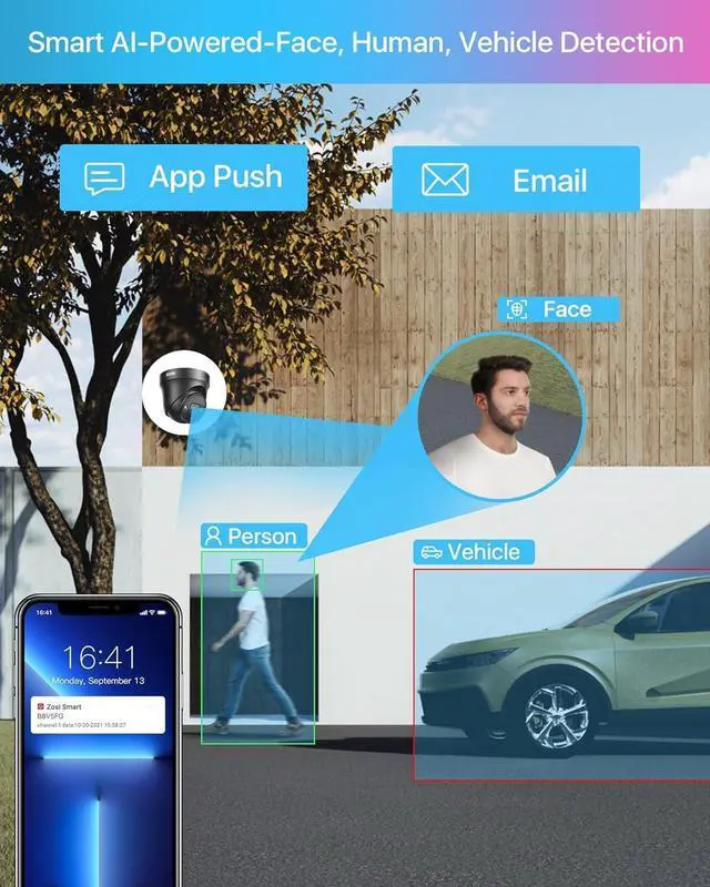 Two Way Audio & Remote AccessThe PoE IP camera Built-in mic and speaker let you stay in touch with your household. So you can talk to your kids or tell your dog to stop barking, or say hello to the delivery man through the Free Zosi Smart App. Free app for live view & Playback on Mobile Phone with Wi-Fi anywhere anytime.