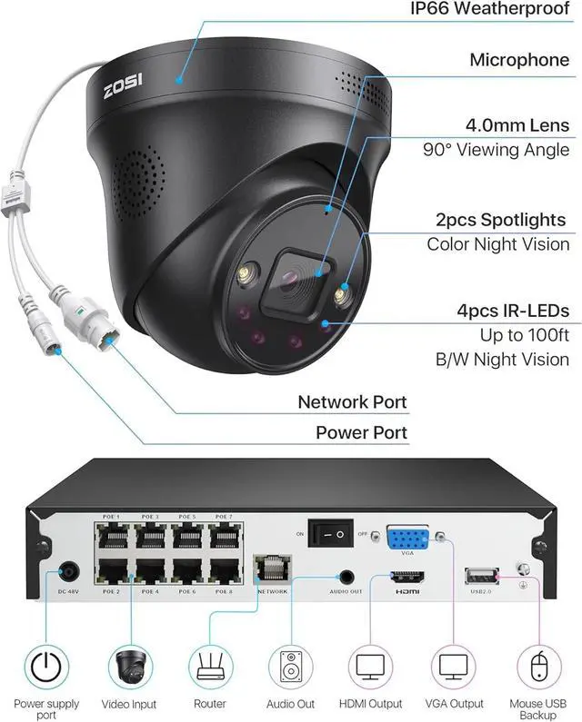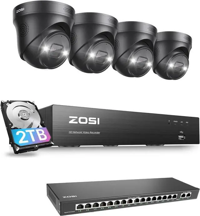 8 Poe Ports,Expandable to 16CH SystemStart with a 8-channel 4K NVR and expand to 16 cameras by adding a PoE switch (supports ZOSI 8MP/5MP PoE cameras). Ideal for large properties or businesses needing scalable coverage. Plug-and-play setup with PoE cables (included) for easy installationno extra wiring hassle.