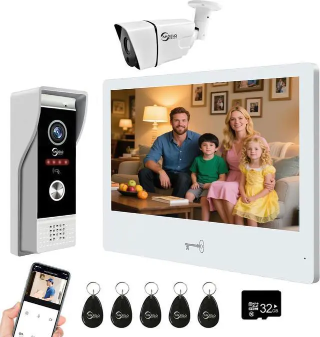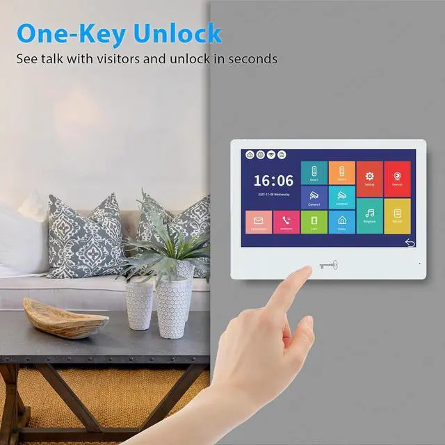 10-Inch Touch Monitor & 1080P Doorbell: Features a responsive 10-inch touch screen monitor with hands-free operation and Wi-Fi connectivity. The outdoor doorbell is built with a waterproof cover, infrared sensor, 1080P camera, 148° wide-angle lens, night vision, and vandal-resistant design. Compatible with all standard 12V electronic locks
