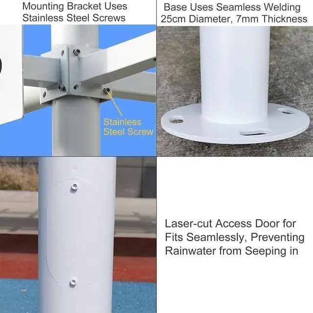 Durable Material: The pole is made of galvanized steel pipe material, which adopts high temperature baking paint plastic spraying process, seamless welding process. It is rust-proof, resistant to sun and rain, can withstand harsh outdoor environmental conditions. The pole is designed with a reserved cable outlet hole and a laser-cut access door, which is tightly sealed and rainwater cannot easily penetrate into the interior.