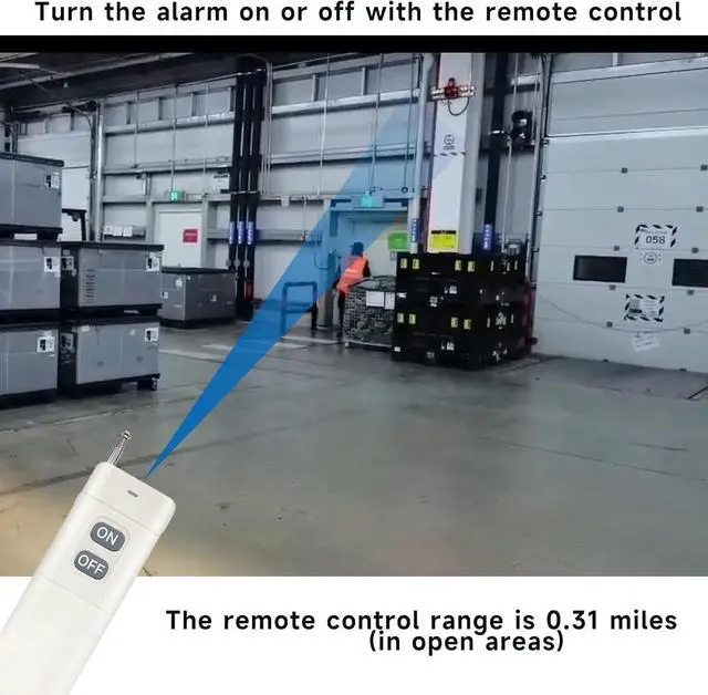 Long-Range Wireless ControlWhen the warning siren is powered on, the industrial alarm is in standby mode and the remote control triggers the alarm! Arm or disarm your alarm with ease from up to 0.31 miles awayNote: The audio andvisual siren is powered by an AC110-120V power supply, and the remote control is powered by a 9V battery! The siren does not contain a button cell battery