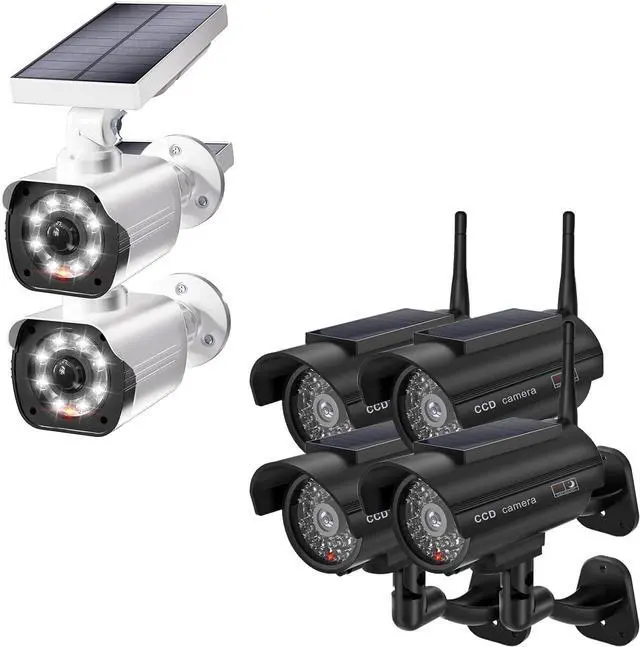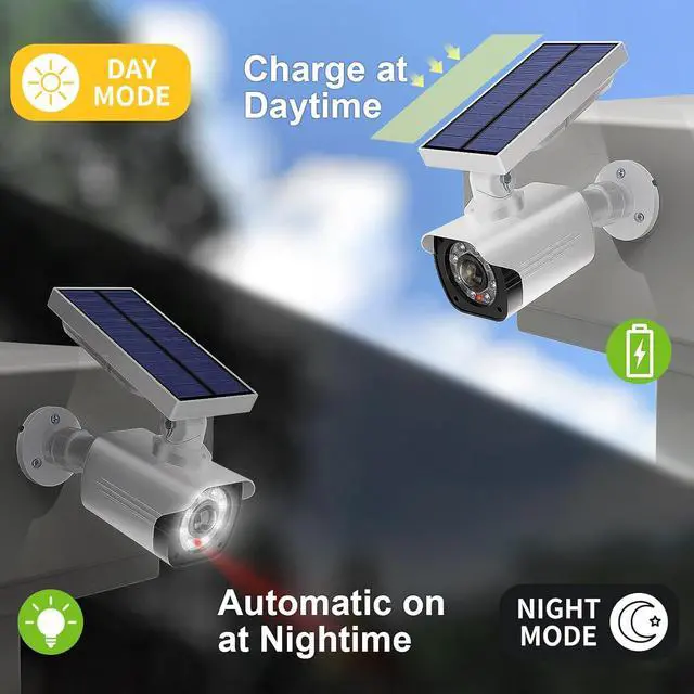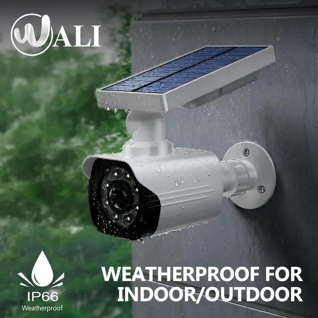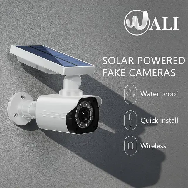 Efficient Usage: WALI outdoor dummy security cameras have a Built-in solar panel that charges during the day to power the red light and floodlights at night. The solar panel and base are freely adjustable to achieve the ideal use and charging angle