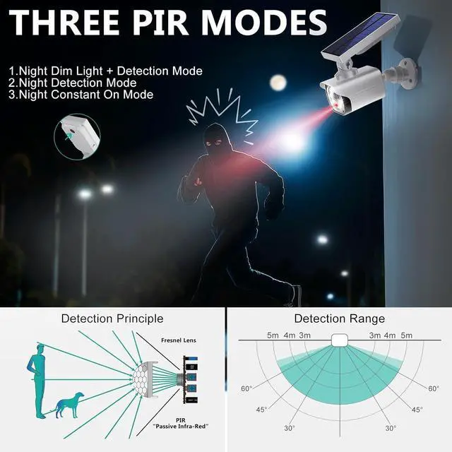 Three PIR Modes: Equipped with an infrared sensor that detects motion from 3 to 5 meters away, these dummy cameras for outside feature three illumination modes - customizable via simple button presses, ensuring reliability even at night