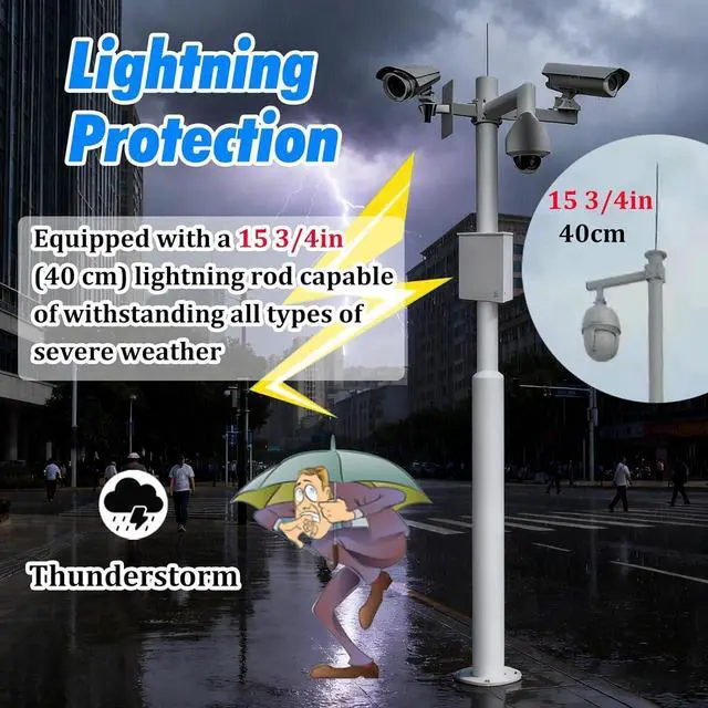 Equipped with 40 cm/ 15.7 Lightning Rods: Our monitoring pole supports all-weather operate, with outdoor camera mounts designed to withstand harsh conditions, ensuring long-term stability and durability during storms and extreme temperatures