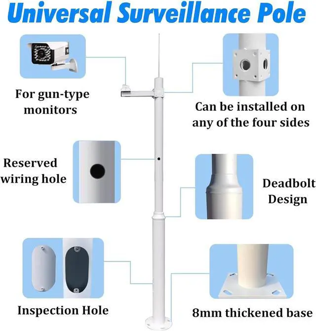 Segmented Surveillance Stand: Our surveillance camera poles consist of 2-3 sections, with a diameter of 7.6 cm/ 3 in for the upper and middle columns and 11.4 cm / 4.5 in for the bottom column, for easy transportation and installation, complete with mounting bolts and grounding cages