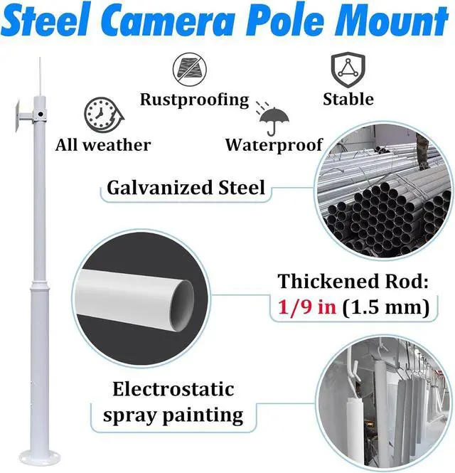 Galvanized Steel Security Camera Pole: Manufactured from 1.5mm/0.06-inch thick galvanized round steel tubing, the light pole is coated with a dense zinc layer through hot-dip galvanization. It features UV resistance, rust prevention, wind pressure resistance, and high/low temperature tolerance