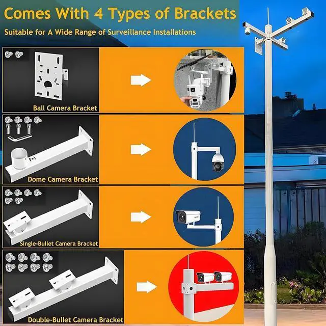 Includes 4 Types of Brackets: 1. Ball Camera Bracket; 2. Dome Camera Bracket; 3. Single Camera Bracket; 4. Double Camera Bracket.Suitable for most camera installation, such as for closed-circuit-television camera, pan/tilt/zoom-camera, dome camera, etc