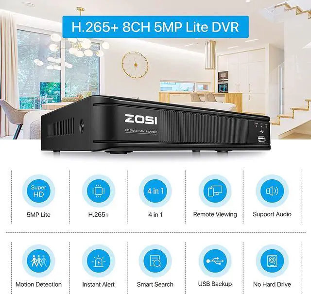 (4). [ Advanced H.265+ High Efficiency Video Compression ] __ ZOSI self-developed H.265+ video coding technology extract features that focus on characteristics of the surveillance scenes for larger storage space and better image quality. H.265+ can further improve compression ratio on the basis of H.265 standard and save about 80% storage compared with H.264, and thus effectively saving storage resources and provides an excellent and smooth viewing experience.